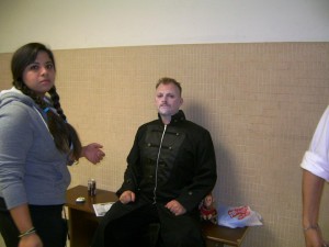 Backstage photo: A. Perez applying makeup to The Dead Writer, actor J. Bulin.