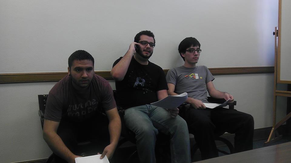 Pictured is newcomer Felix Cruz III, Danny Cantu (“The Rape of Lucrece”, PrePunch), and Caleb Bonitz (“…Wonderland” series, “Twas the FLOP…”) rehearsing a scene for the comedy “Flight 1862.” This play will be for the March “T.O.” performance.
