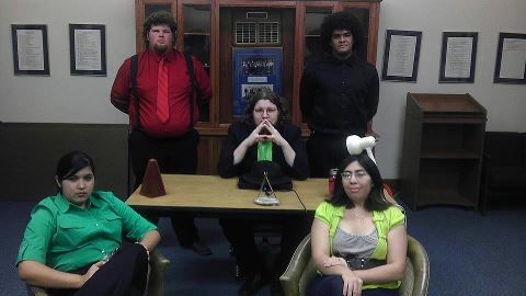 Seated clockwise from top left: Stephen Clark and Vince Chavez as the Henchmen, Chelsea Tovar as the Secretary, Samantha Garcia as Ava Westfield (Wicked Witch), and center is CJ Lillie, playing Sherwood “OZ” Payes.