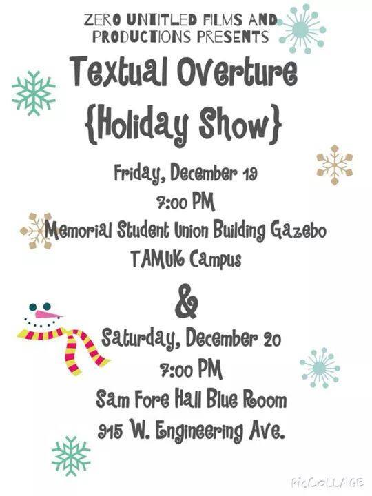 Textual Overture’s first annual Holiday Show was a great success! As usual, there were a variety of events, readings, play performances, and Christmas tunes performed on both nights – Friday the 19th and Saturday the 20th. Both nights had slightly different acts as some performers/readers only presented one of the two nights.