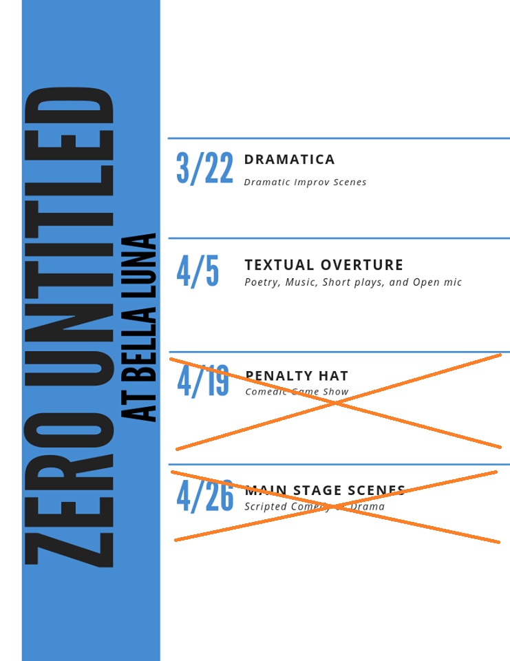 UPDATE: Remaining April shows have been CANCELLED due to scheduling conflicts with other productions. Our return to the venue will be announced as soon as possible!