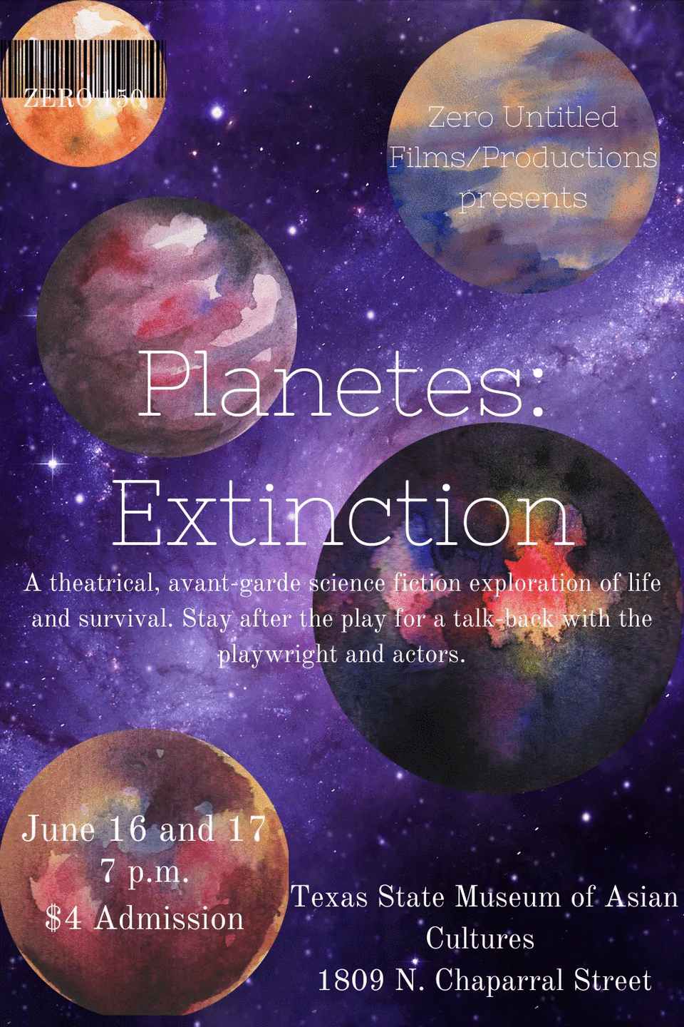 Well, it is official! Texas State Museum of Asian Cultures in Corpus Christi will play host to Zero Untitled for the world premiere performance of “Planetes: Extinction”, a new science fiction avant-garde play (written and directed by) Michael Verderber on June 16 & 17, 2022.