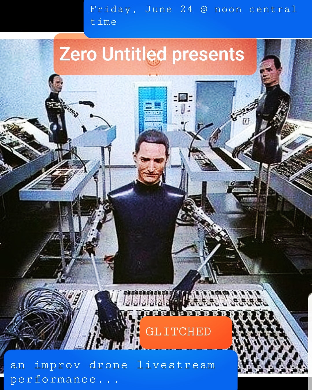 Michael Verderber’s new drone/poetry project, GL1TCH3D, had a work-in-progress performance on May 28, 2022 as part of Drone Day. Although not currently a fully fledged Zero Untitled project, GL1TCH3D is well on it’s way to completion with livestreaming performances planned (dates TBD). The performance is viewable from his personal Instagram.