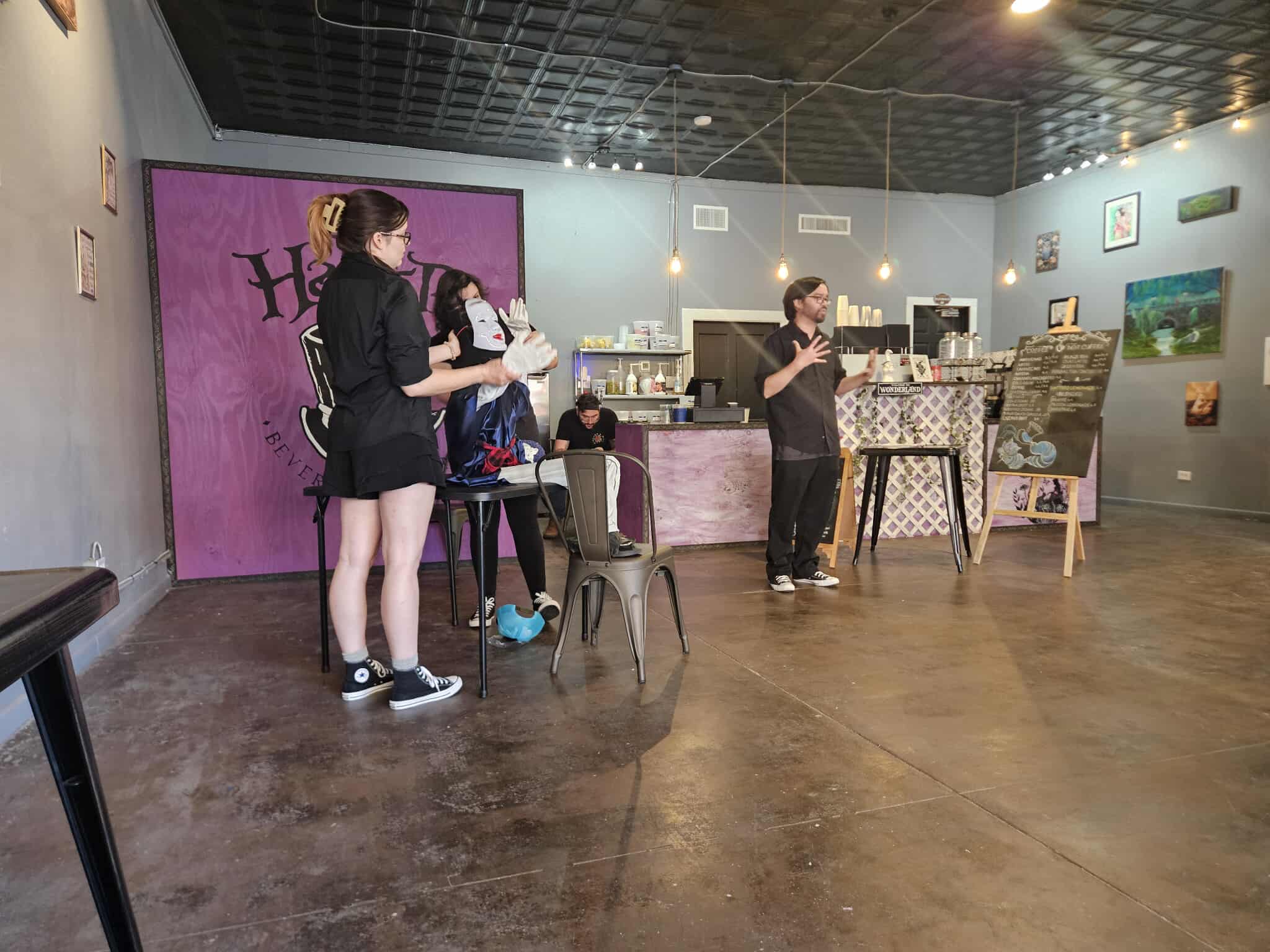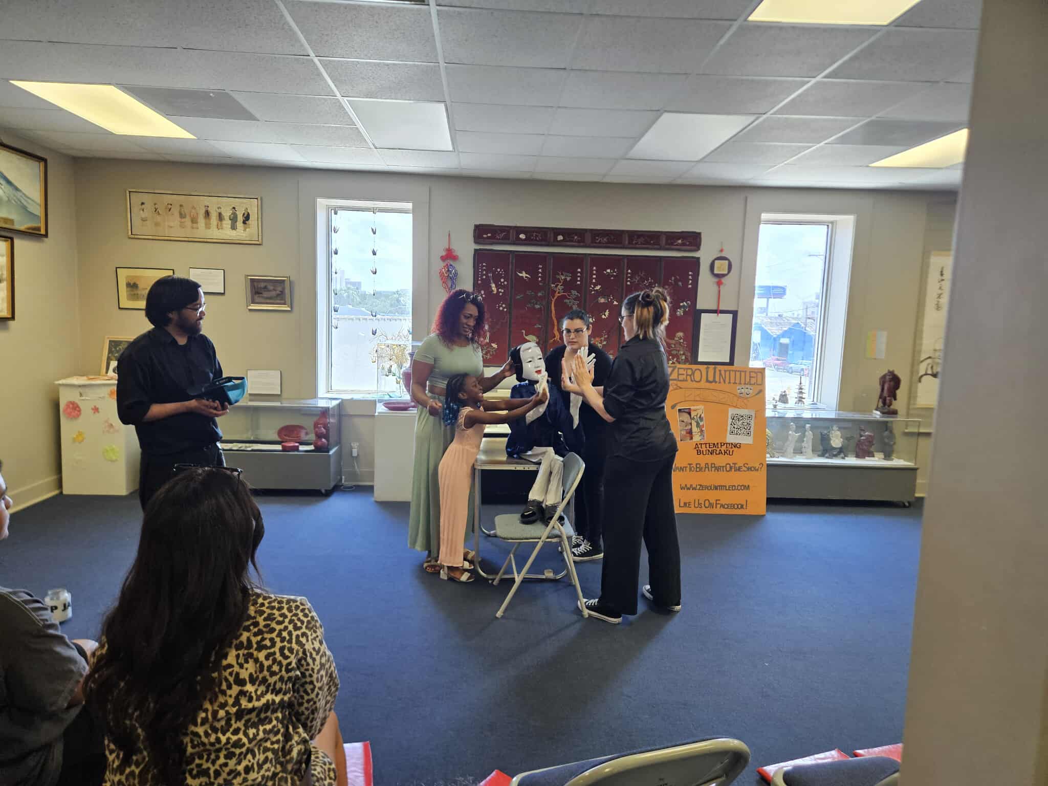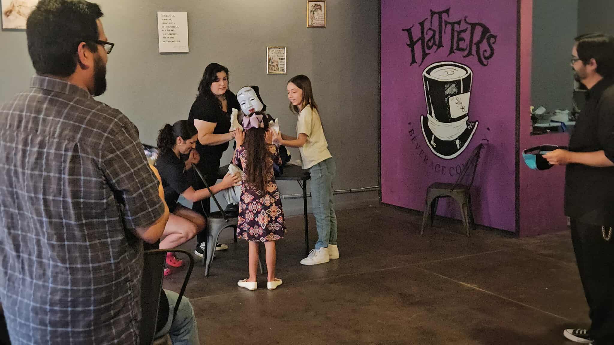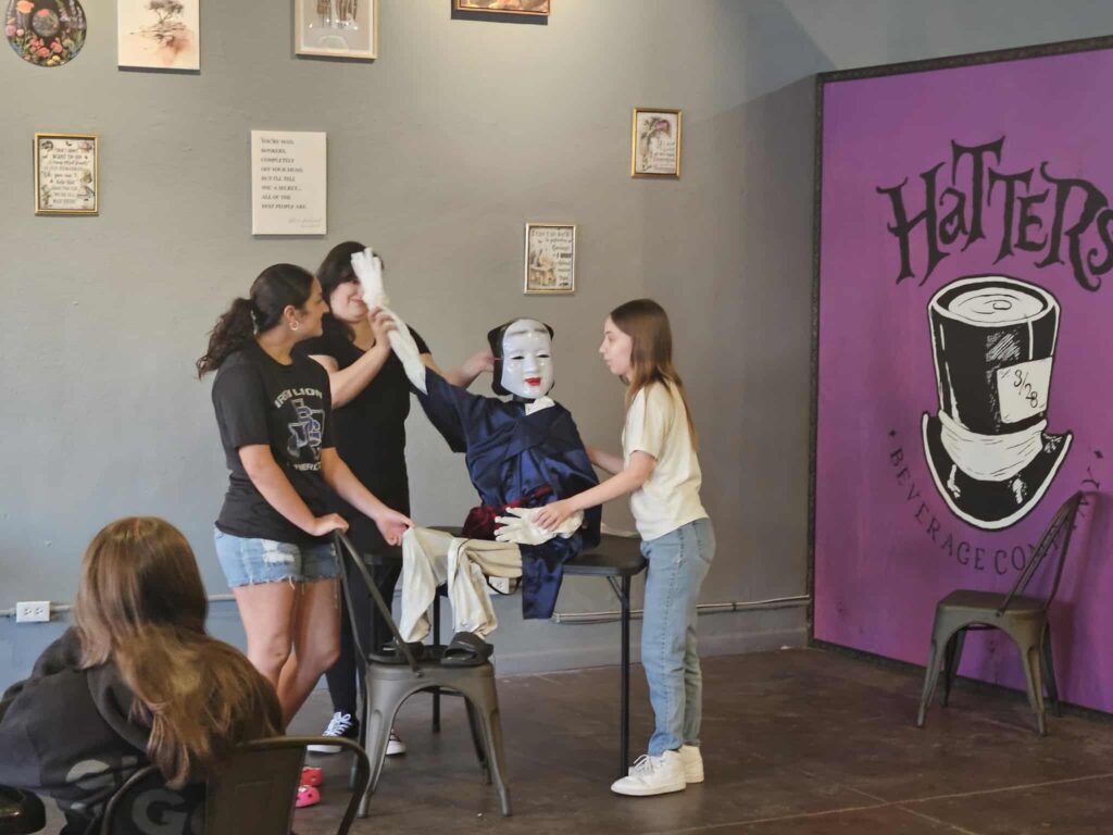 Below are photos from the premiere of the show on July 12, 2025 at Hatters Beverage Company in Kingsville, TX. ZU Puppeteers deshi/omo zukai were Katherine Orozco-Verderber, Aubrey Gracia, and Michael Verderber.