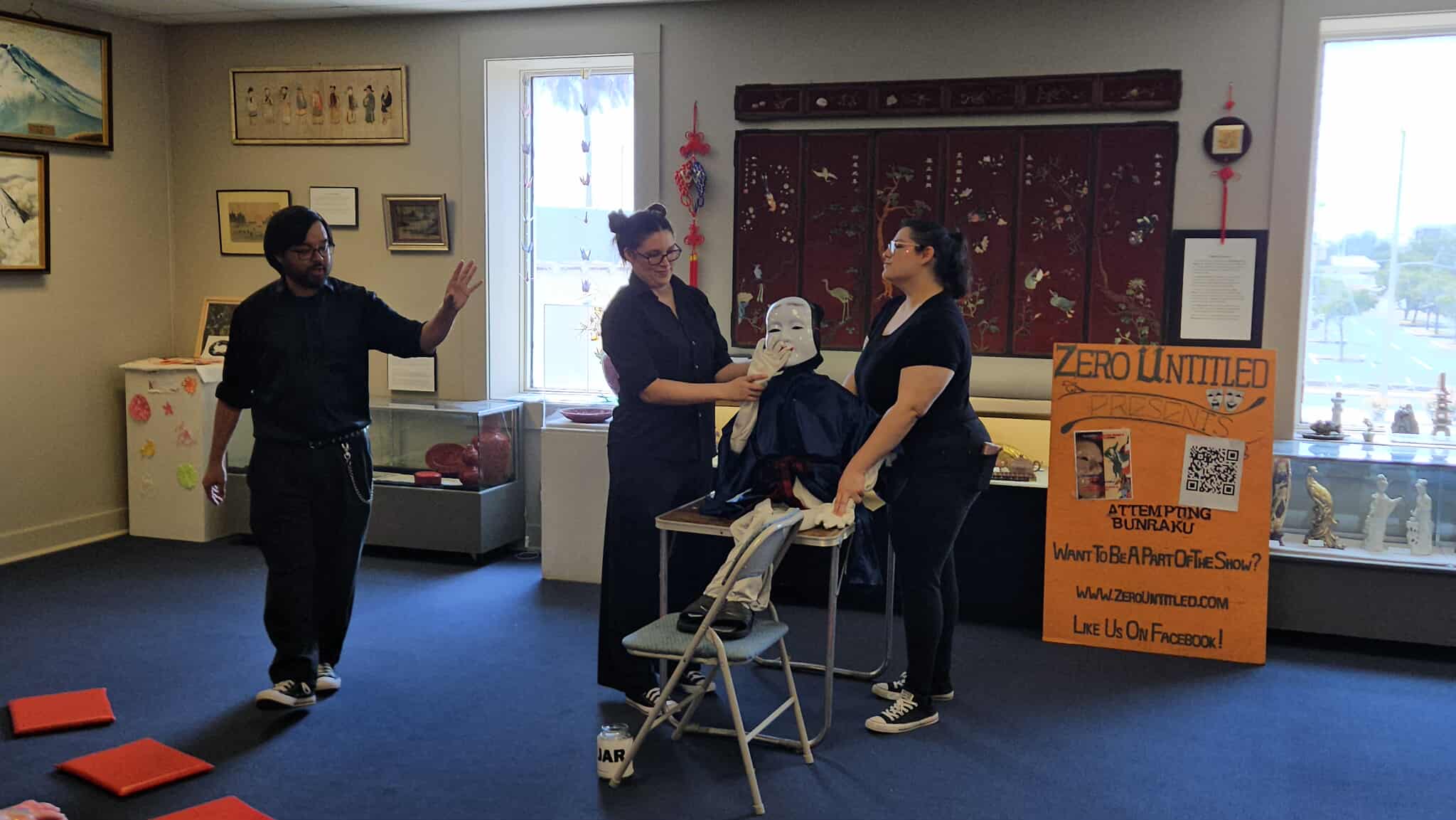 Unfortunately, we do not have 30 years to develop such a craft, but what we can do is ATTEMPT BUNRAKU in our brand-new interactive show of the same name. “Attempting Bunraku” will allow audience members to join us on stage to learn the fundamentals of bunraku; audience members will be invited up to attempt to learn a bit about the craft of bunraku alongside Zero Untitled puppeteers. They will be given tasks to perform so that they learn a bit about the bunraku experience. Make no mistake: we are not trying to live up to the talents of the Masters, but only trying to share in the puppetry experience.