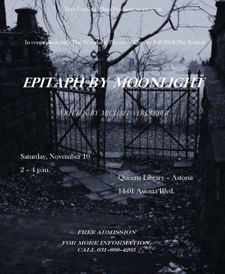 The Woodside Players of Queens have just accepted the short drama “Epitaph by Moonlight” (written by Michael Verderber) for performance in November at their play festival. The cast will be built from the Zero Untitled – NY folks; cast information is coming soon. The play was last performed in 2009 as part of a Dia De Los Muertos festival.