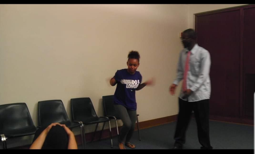 An unidentified actor on floor, Mo Holley, and Trimon Small in an improv game.