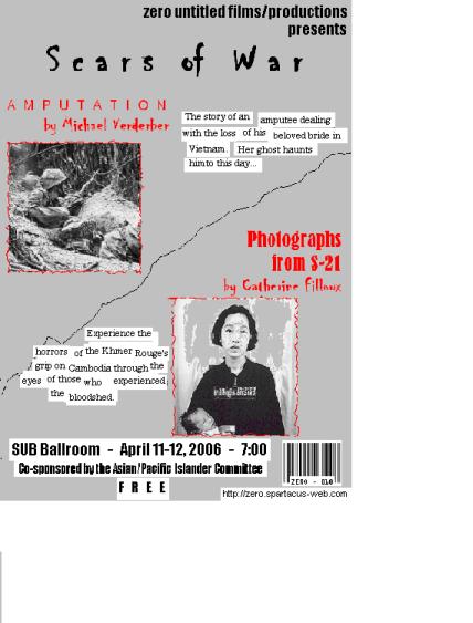 Scars of War: “Amputation” & “PfS21″ is a double bill focusing on the repercussions of war on the human psyche. Co-sponsored by the Asian-Pacific Heritage Committee at TAMUK,was performed at the Memorial Student Union Building at the Texas A&M University-Kingsville campus on April 11-12 at 7:00. Free admission.