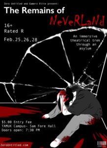 The eleventh Dark Tour is finally upon us! February marks a return to the Carroll Ward (home to 2016’s “Neverland Lost” production). “The Remains of Neverland” returns the Dark Tour to its roots in both production and performance space. Collaborating with Gamerz Elite, they have rented the entirety of Sam Fore Hall (home to the first six Dark Tours) on the campus of Texas A&M University – Kingsville to bring the next major production to light.